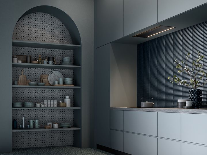 A series of parallel LED strips showcase the precise shape of the new Parallel built-in hood by Falmec